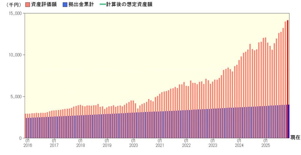 恵まれた期間にここに移れてラッキーでした。 驚異の利回りで運が良いとしか言いようがありません。図を見れば明らかですよね。拠出金の約4.5倍になりました。 選択と積み上げたものとが合わさるとこんな感じなるのでしょう。 体現出来て説得力がありませんか! 長期・積み立て・分散がベースとなりますがそのものです。